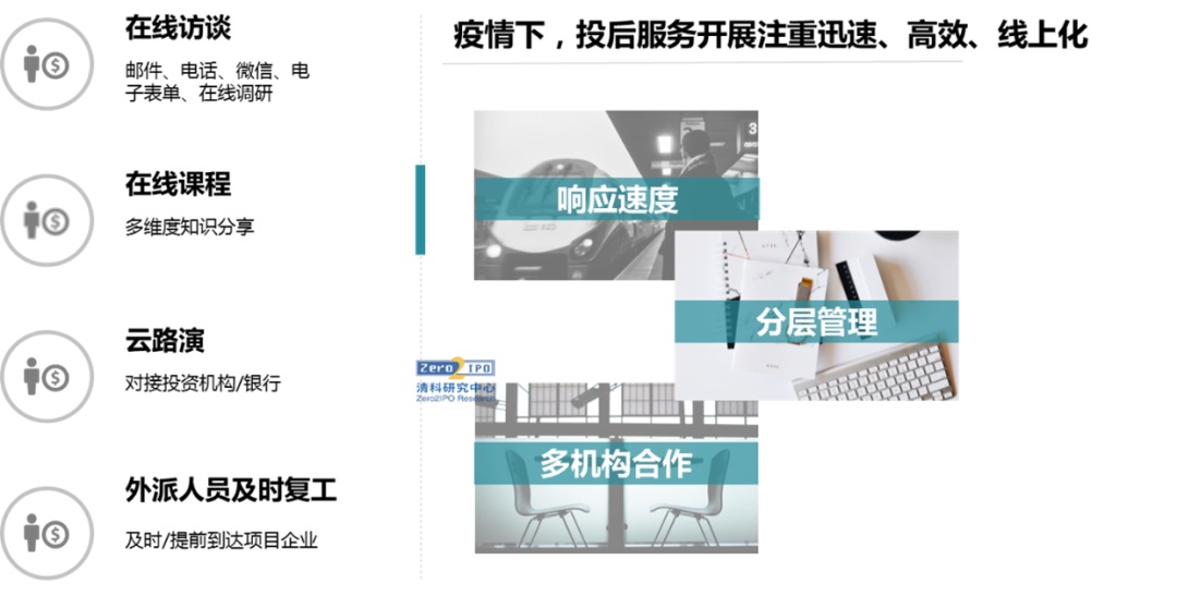 在严酷的物理隔离之下,,,,,,机构投后效劳开展注重高效化、线上化。。。。。。。通过在线访谈、电子表单等形式网络被投企业信息;;;通过线上课程解答众多创业企业需要面临的共性问题;;;原本线下举行的资源对接会、路演也转为了“云路演”,,,,,,为企业高效对接资源。。。。。。。针对有外派职员的并购类、工程类项目,,,,,,外派职员实时甚至提前到岗,,,,,,加速企业清静复工复产。。。。。。。