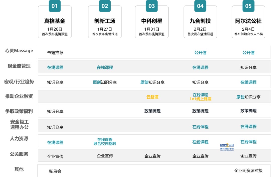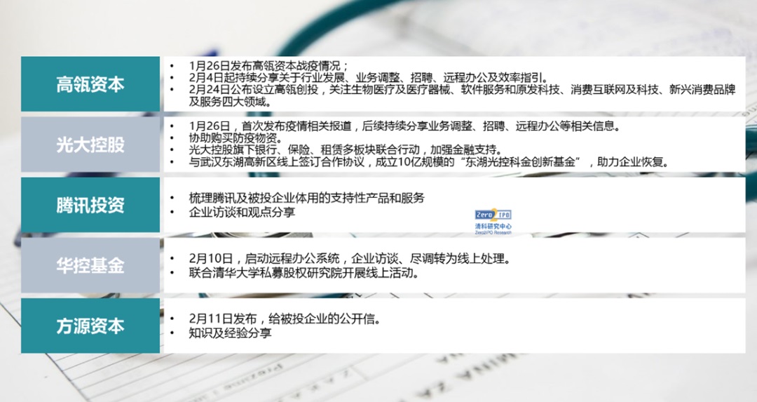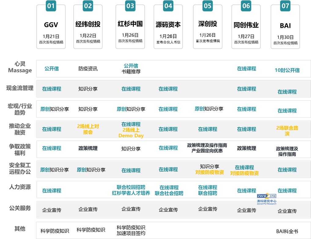 VC机构是投后效劳系统较为健全的一类。。。。。。。面临突发状态,,,,,,VC机构投后效劳启动迅速,,,,,,例如1月26日,,,,,,红杉中国即宣布了《红杉中国给成员企业的一封信》,,,,,,发出对被投企业的三个提醒。。。。。。。红杉、源码资源、GGV等机构均迅速开展了系列课程,,,,,,涵盖远程办公协作、劳动规则培训、疫情时期的融资战略、疫情时代的财务危害治理以及疫情时期的人力资源优化等方面。。。。。。。红杉、经纬、BAI率先实验了线上路演形式;;;红杉、深创投、源码资源资助企业解决春招难题。。。。。。。