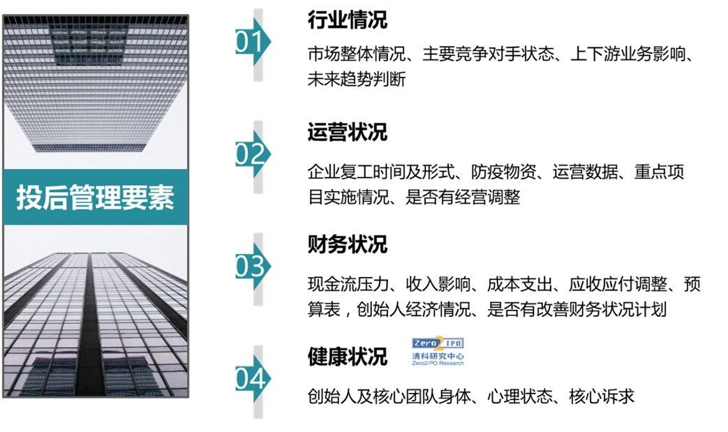 全球性黑天鹅事务爆发,,,,,,企业谋划治理和抗危害能力正面临极大磨练,,,,,,机构在这一特殊时期,,,,,,需要一连对被投企业运营状态、财务状态举行跟踪。。。。。。。相识企业复工安排、重点项目希望情形、眷注首创人的身心康健,,,,,,随时关注和掌握被投企业的痛点和诉求。。。。。。。同时,,,,,,凭证企业反响情形和数据,,,,,,重新评估被投企业,,,,,,出具危害提醒文件、制订危害控制战略。。。。。。。在企业面临逆境时,,,,,,高频跟踪和深入相同是投资机构实时解决企业难题、把控项目危害的最佳计划。。。。。。。