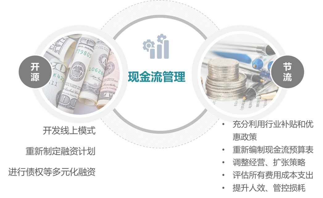 疫情之下,,,,,,企业现金流泛起;;;,,,,,“开源节约”、“留足12个月运营资金”的呼声一直于耳。。。。。。。“开源”方面,,,,,,勉励企业跳出原有运营模式,,,,,,评估打造线上产品的可能性,,,,,,同时重新制订融资妄想,,,,,,周全相识“股权”和“债权”融资方法,,,,,,调解估值预期。。。。。。。“节约”方面,,,,,,充分使用行业津贴和优惠政策,,,,,,例如延迟缴纳社保等,,,,,,实时调解谋划战略,,,,,,降低扩张速率和津贴力度,,,,,,体例未来一年现金流预期表,,,,,,实时处置惩罚应收应付,,,,,,评估销售、薪酬、房租等用度项目,,,,,,制订合理降本妄想。。。。。。。