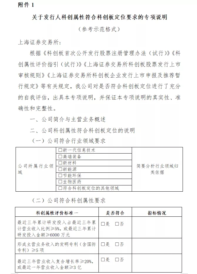 在《暂行划定》中,,,,“关于刊行人科创属性切合科创板定位要求的专项说明”、“关于刊行人科创属性切合科创板定位要求的专项意见”两个附件格外引人注重。。。。在提供“考卷”的纲要之外,,,,上交所还知心地附上了标准谜底作为参考树模。。。。