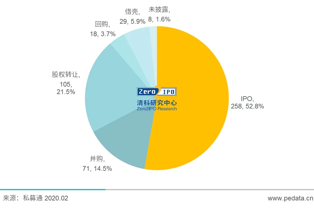 凭证清科研究中心《2020中国医疗器械行业投融资剖析报告》,,,2014-2019年,,,中国医疗器械行业退出案例数共488笔,,,退出金额共501.0亿元。。。。其中,,,IPO退出258笔,,,占总退出案例的52.8%,,,退出金额达347.37亿元,,,占总退出金额的69.3%;;;其次是以并购的方法退出,,,共71笔事务,,,数目占比14.5%,,,退出金额达83.19亿元,,,占总退出金额的16.6%。。。。