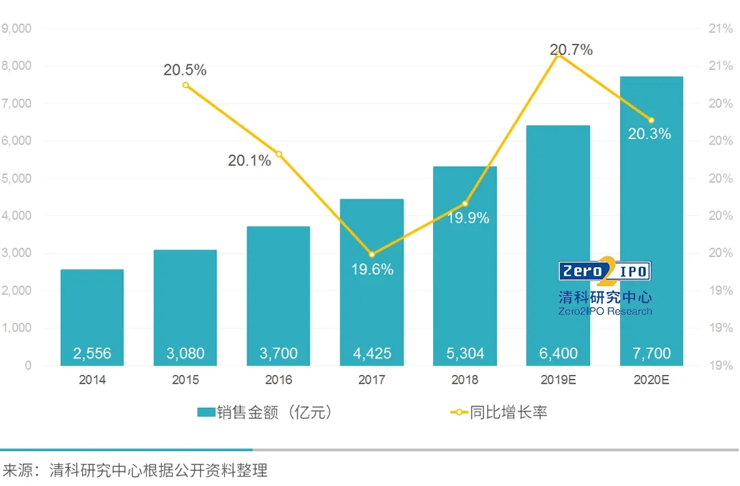 随着医疗器械政策情形一连改善,,,国产自主立异器械一直问世,,,资笔弃力行业加速吞并重组,,,中国医疗器械市场规模一连增添。。。。2014-2018年,,,中国医疗器械市场规模从2556亿元一连增添至5304亿元,,,五年间市场规模扩大了一倍,,,年均增添率约20.0%,,,凭证20%的同比增添率估算,,,预计2020年中国医疗器械市场规模将抵达7700亿元。。。。