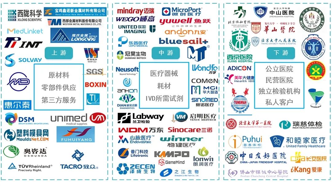 从医疗器械工业链来看:上游主要是医疗器械用原质料、零部件供应、第三方效劳等;;;中游主要是医疗器械、耗材、IVD所需试剂等;;;下游主要是种种医疗机构,,,包括公立医院、中小型民营医院、自力磨练机构、私人客户等。。。。