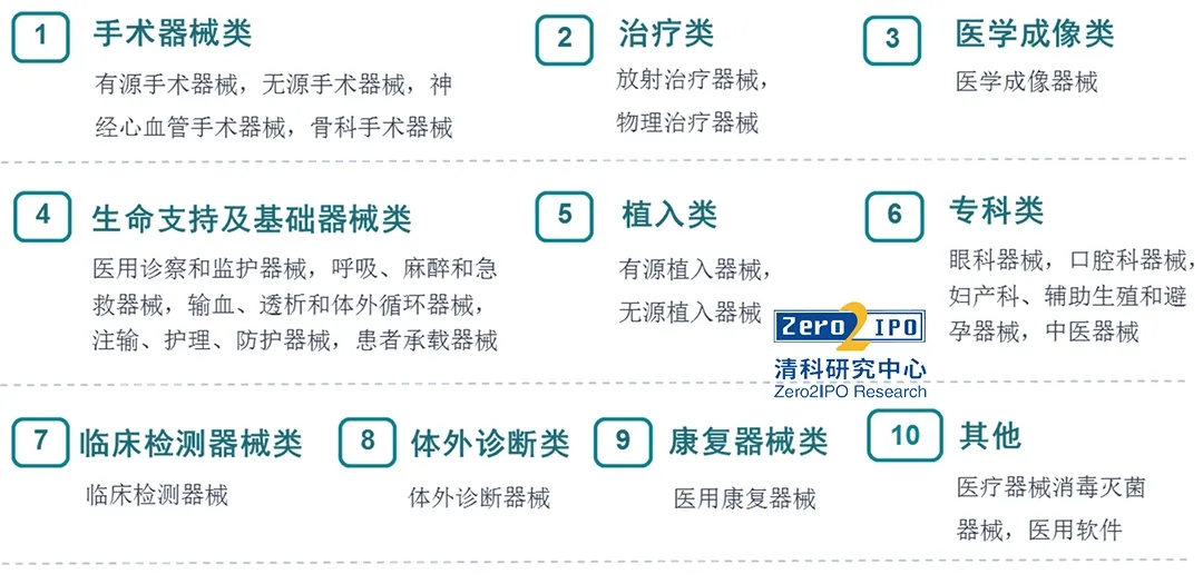 医疗器械,,,是指直接或者间接用于人体的仪器、装备、用具、体外诊断试剂及校准物、质料以及其他类似或者相关的物品,,,包括所需要的盘算机软件。。。。连系原国家食药监总局《医疗器械分类目录》和医疗器械市场投融资特点,,,本研究将医疗器械产品分为10个大类,,,包括:手术器械类、治疗类、医学成像类、生命支持及基础器械类、植入类、专科类、体外诊断类、临床检测器械类、康复器械类等。。。。