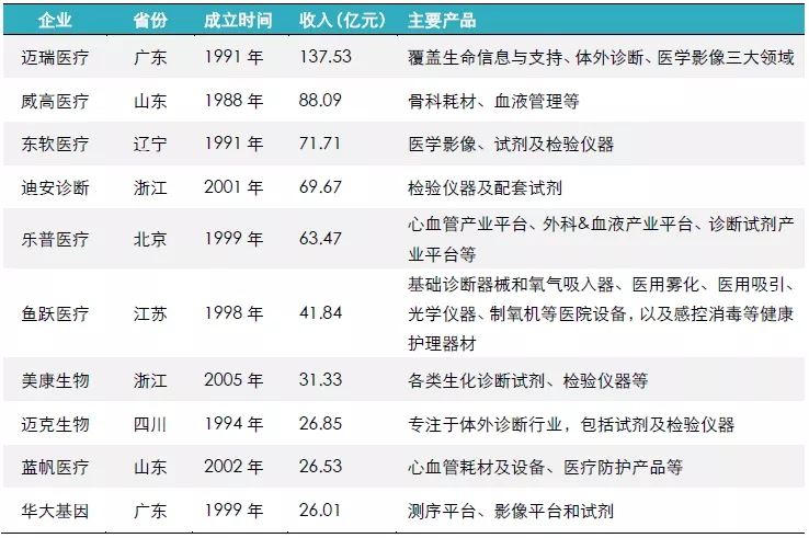 整体来看,,,中国生长活跃的医疗器械企业相对集中在东部沿海地区,,,平均建设时间一样平常凌驾20年,,,主要产品集中在体外诊断制剂及磨练仪器、医学影像等细分领域。。。。凭证果真数据,,,2018年,,,中国医疗器械企业TOP10总营收为583亿元人民币,,,占2018年中国医疗器械市场规模的11%,,,远低于全球医疗器械市场44%的行业集中度。。。。